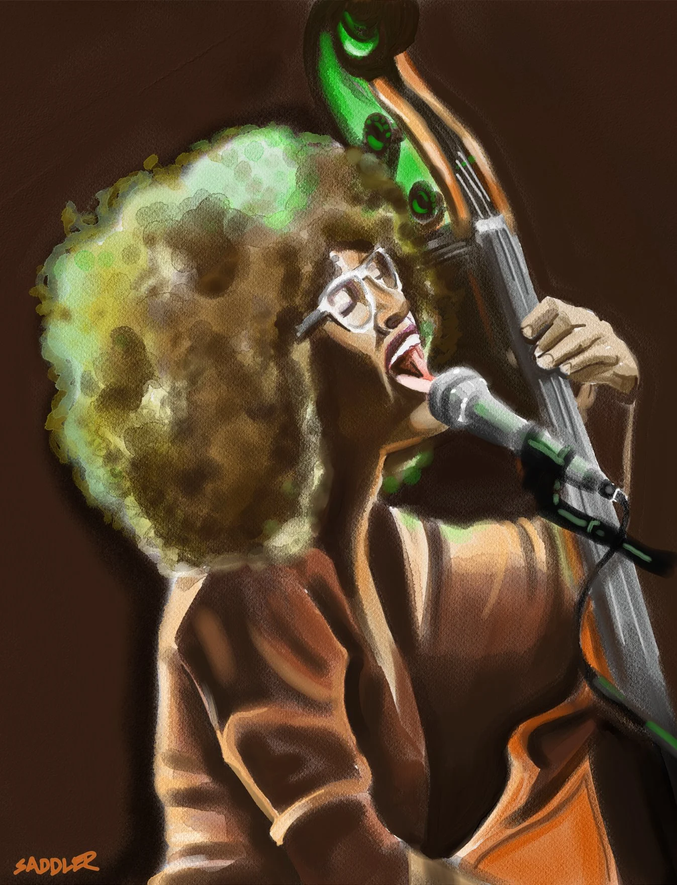 Digital watercolor- The beginning of a series of sketches of Esperanza Spalding after seeing her perform live at the Hyatt Newporter over the summer. Her unique hair and facial expressions make her an interesting subject to draw.